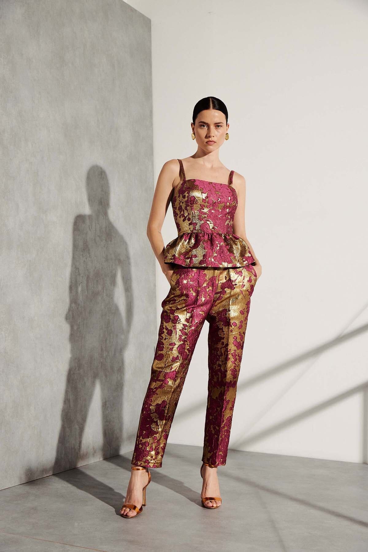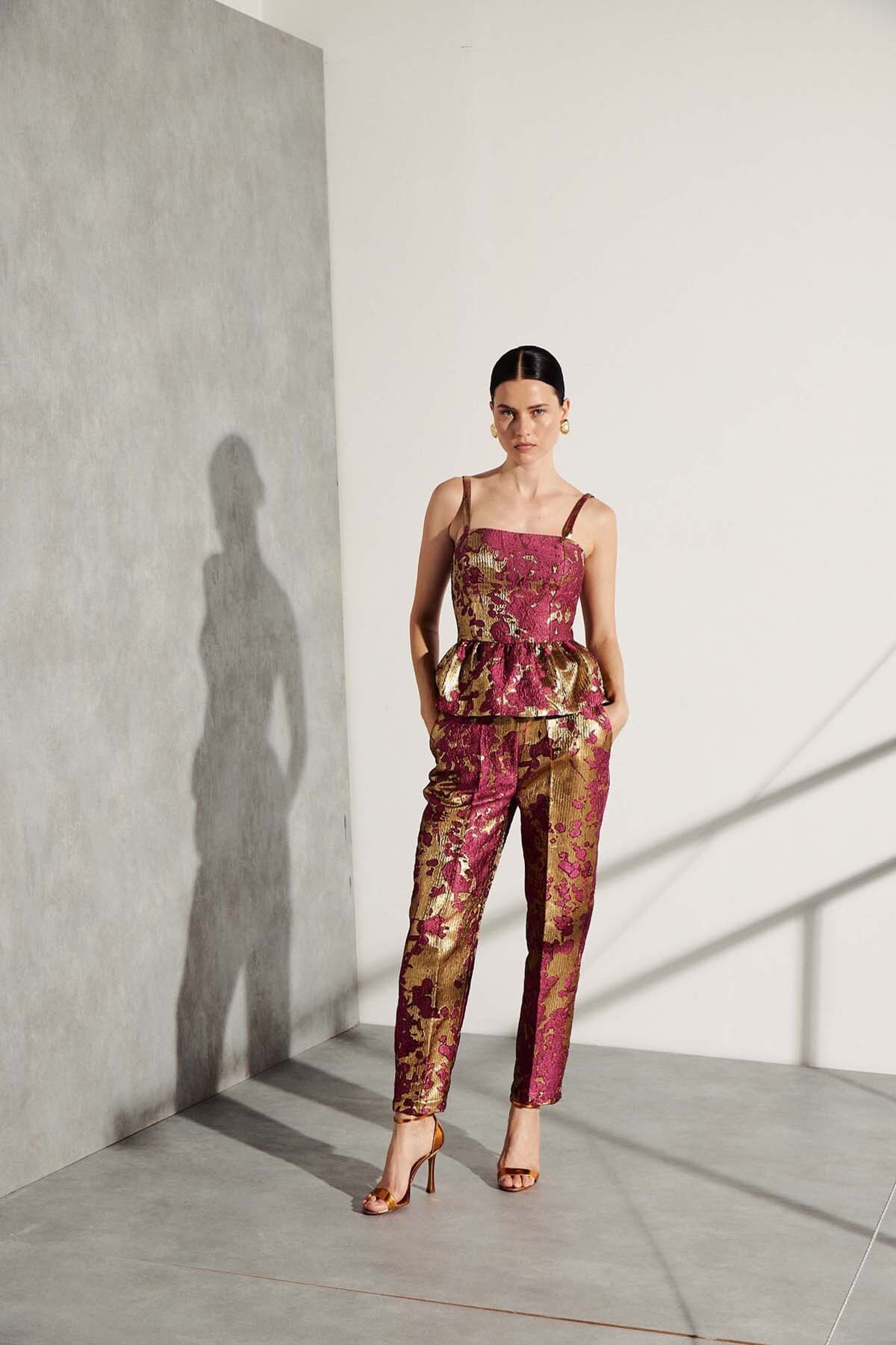 Calça de alfaiataria em jacquard estampado corte reto, bolsos faca e cós reto com passantes. Fechamento por botão interno e zíper.