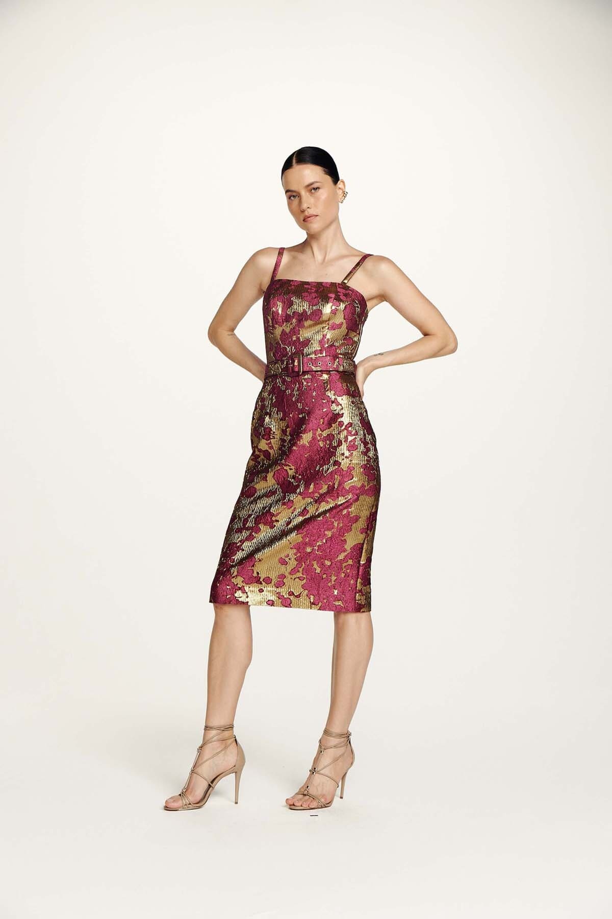 Vestido de jacquard, comprimento midi de alcinhas com saia tubo, acompanha cinto forrado do próprio tecido, fechamento por zíper no centro-costas.